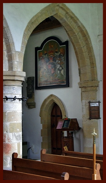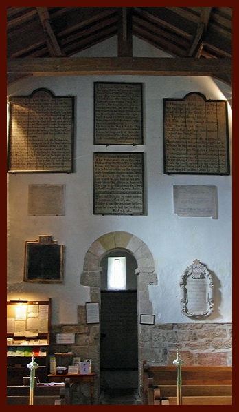 The nave is basically the C11th church and has a magical atmosphere. On the side walls are the stone benches used by the old and infirm before churches had pews. At the west end is the original Saxon doorway into the church. On either side of the arch are painted boards with the Lord's Prayer, Creed and Ten Commandments.